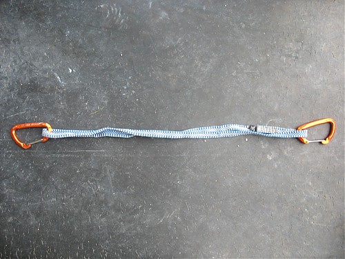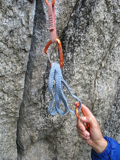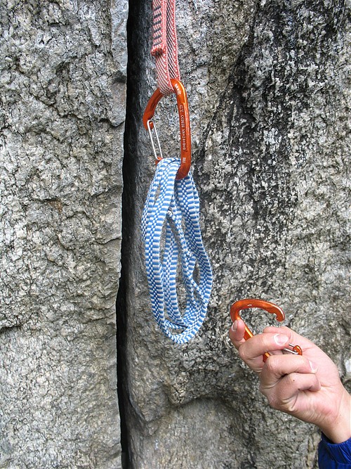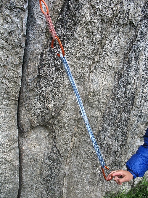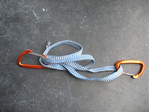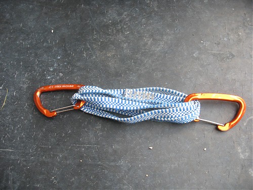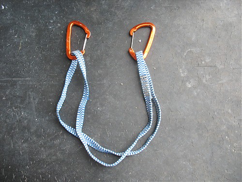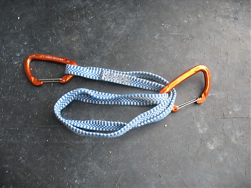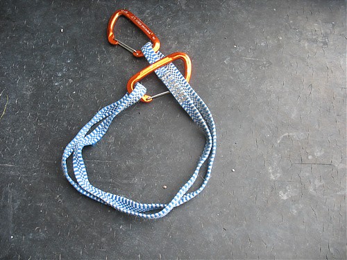 1. Zamiast normalnego ekspresa bierzemy dwa karabinki i taśmę długości około 60 centymetrów. Najlepiej użyć do tego taśmy z dyneemy i lekkich karabinków (waga 30 g lub jeszcze mniej), przy okazji stracimy sporo na wadze, co jest bardzo ważne przy wspinaczce wielkościanowej (w myśl zasady „light&fast”).